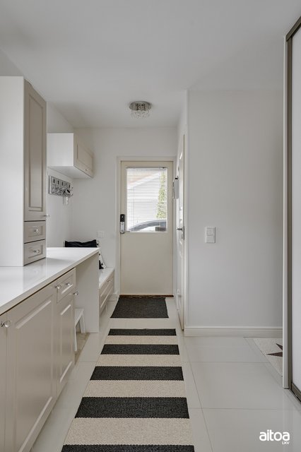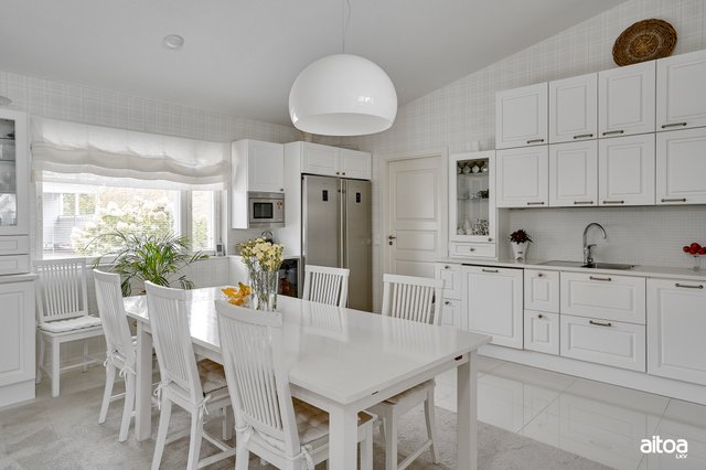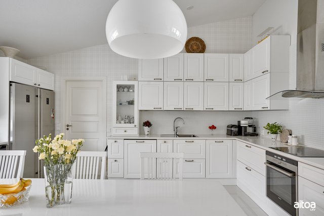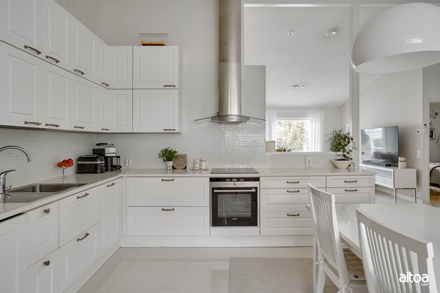 - Jääkaappi, pakastin, liesituuletin, induktioliesitaso, erillisuuni, integroitu astianpesukone, integroitu mikroaaltouuni, viinikaappi, sähköinen lattialämmitys. Keittiö remontoitu vuonna 2013.