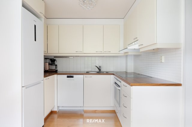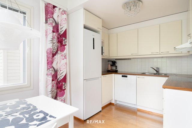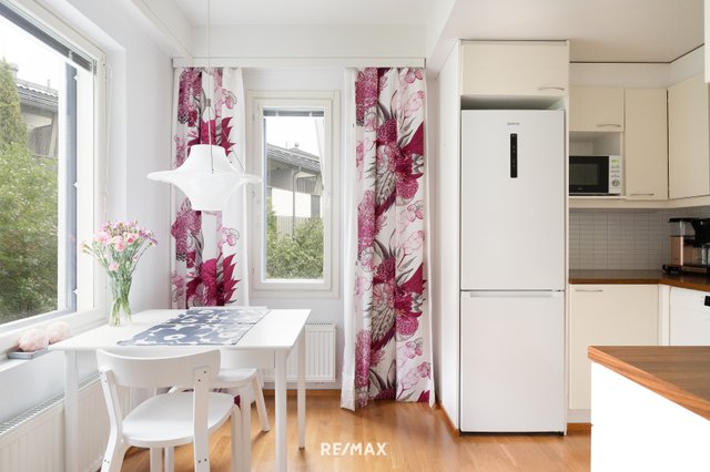 Keittiössä on käytännöllinen, selkeä kulmaperustus: kaappi- ja tasotilaa, täyskorkea jää-pakastinkaappi sekä integroidut kodinkoneet. Ikkunallinen, vaaleasävyinen aamiaiskulma kahden ikkunan kulmassa on täydellinen paikka päivän aloitukseen.