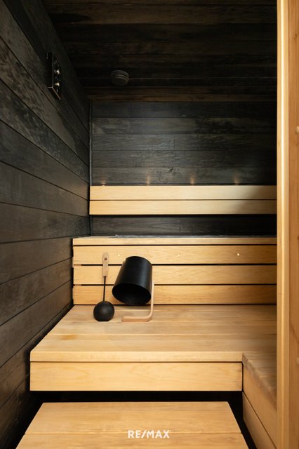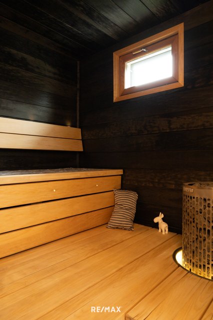 Yläkerrassa on tilava makuuhuone, oma vaatehuone sekä tyylikäs saunaosasto. Saunassa tummat seinäpaneelit, kauniit lauteet ja ikkuna luovat hemmottelevan tunnelman – täällä rentoudut päivän päätteeksi varmasti.