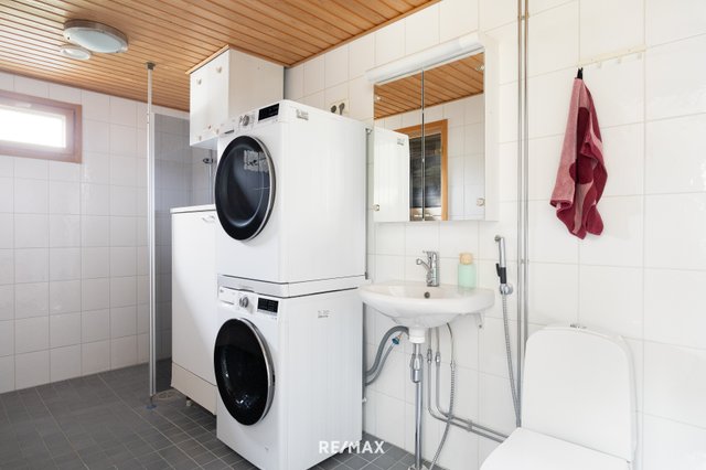 - WC-istuin, suihkuseinä, peilikaappi, suihku, pesukoneliitäntä, bidee-suihku, ja lattialämmitys
