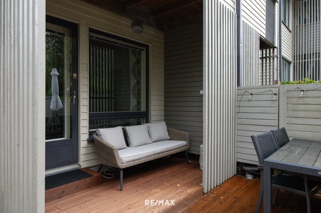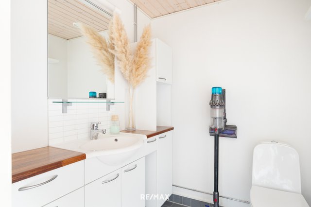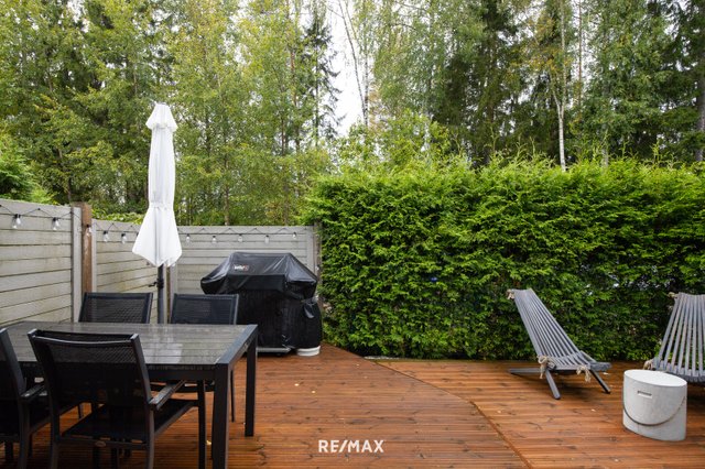 Alakerran sydän on avara olohuone, johon suuri ikkuna ja ikkunallinen ovi tuovat runsaasti luonnonvaloa. Olohuone jatkuu viihtyisälle, länteen suuntautuvalle terassipihalle – suojaisa tuija-aita, tilaa ruokailuryhmälle ja grillille sekä oma nurkkaus rentoutumiselle tekevät pihasta kesän suosikkipaikan. Arkea helpottaa alakerran erillinen wc.