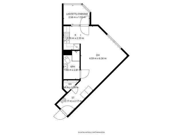 - Ei tarkistusmitattu. Pinta-alat saattavat tämän ikäisissä kohteissa (yhtiö rekisteröity ennen 01.01.1992) poiketa olennaisestikin asuinrakennusten nykyisten mittaustapojen ja standardien (SFS 5139) mukaan laskettavasta asuintilojen pinta-alasta. Pinta-ala voi siis olla edellä mainittua pienempi tai suurempi.