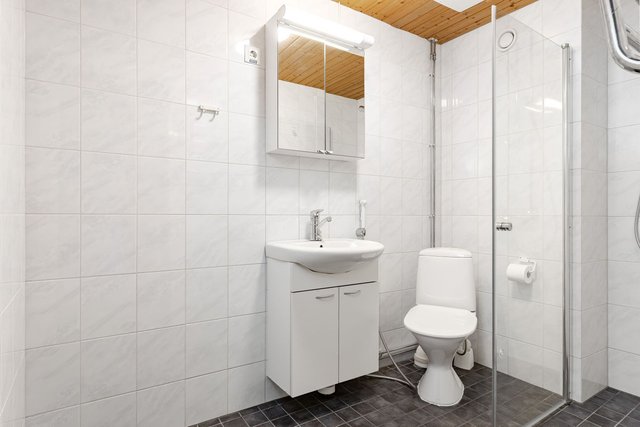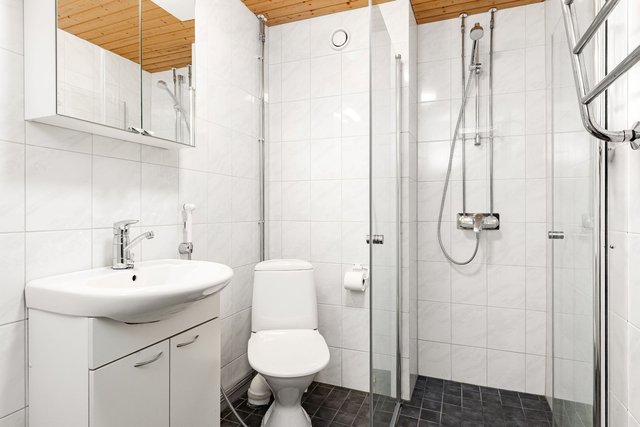 - WC-istuin, suihku, suihkuseinä, pesukoneliitäntä, bidee-suihku, allaskaappi, pesuallas, peili, ja peilikaappi