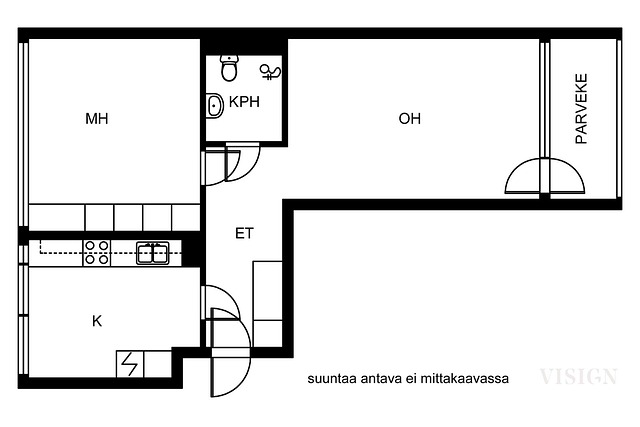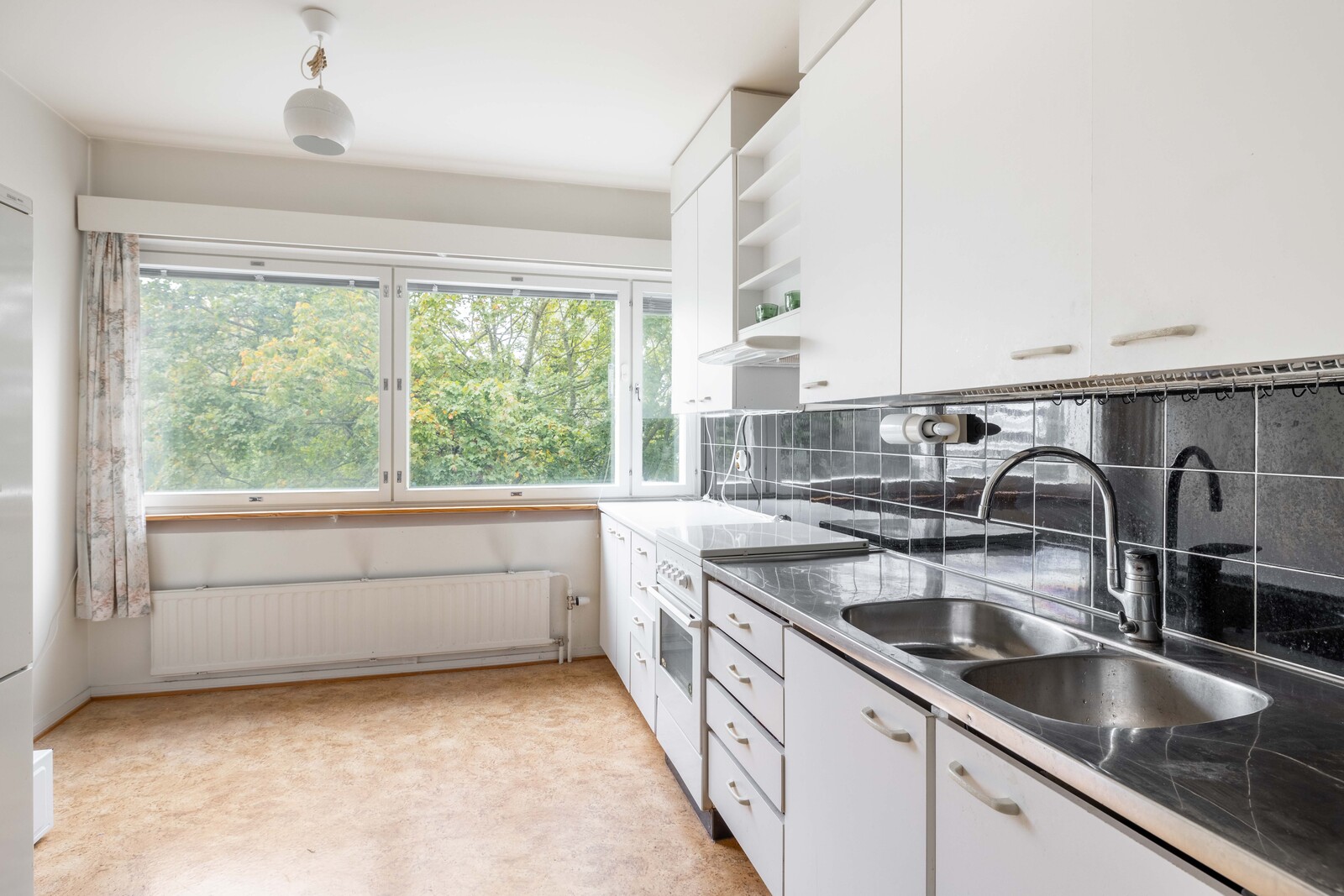 Tässä läpitalon asunnossa on tilava erillinen keittiö, valoisa makuuhuone sekä olohuone, josta on käynti lasitetulle parvekkeelle. Parvekkeelta avautuvat rauhalliset, puistomaiset näkymät. Kylpyhuone on uusittu linjasaneerauksen yhteydessä.