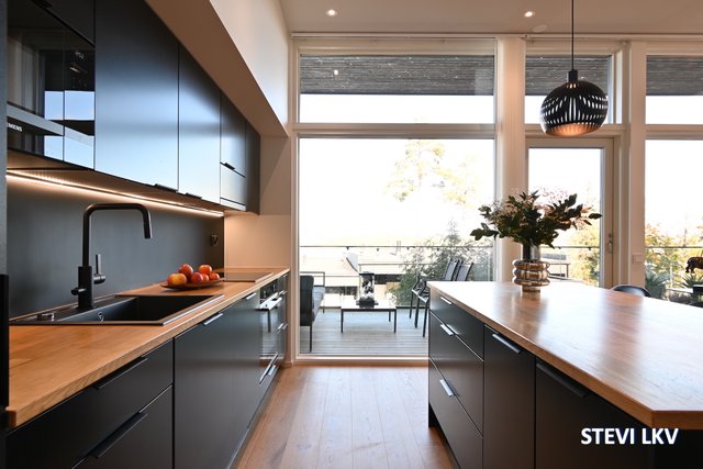 - Kodinkoneet ovat kalusteisiin integroidut & tasot tammea. Keittiö osittain uusittu 2023 (saarekkeen taso, mikro, uuni, vetimet, allas, hana, sivukaappi). Kalusteet Unique Home.