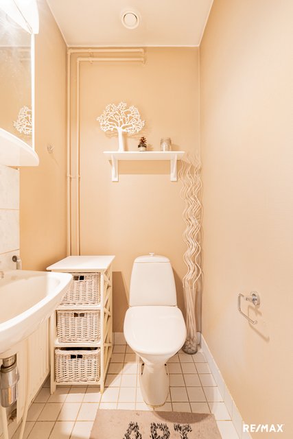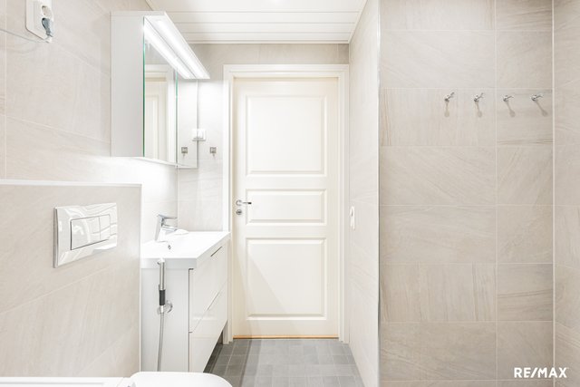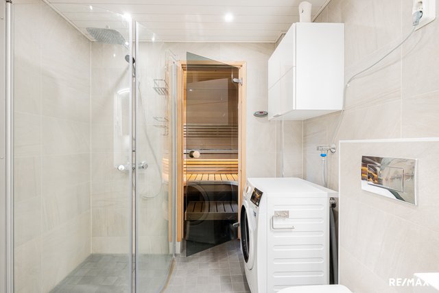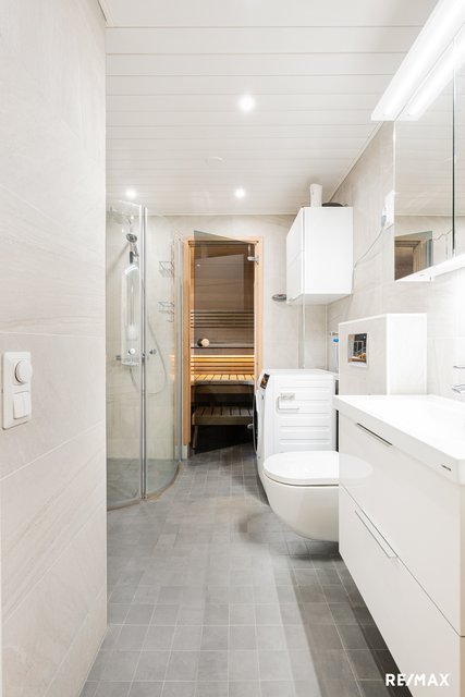 - WC-istuin, suihku, suihkuseinä, pesukoneliitäntä, lattialämmitys (sähkö), pesuallas, allaskaappi, ja peilikaappi