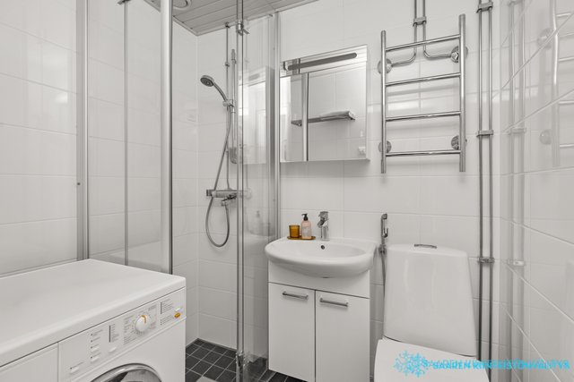 - Erittäin siisti ja hyväkuntoinen kylpyhuone. Yhtiössä on tehty perinteinen putkiremontti 2014-2015, jonka yhteydessä kylpyhuone on remontoitu. Kylpyhuoneessa on tehty Nanopinnoitus (laattapinnat), silikonit uusittu suihkunurkan ja allaskalusteen kohdalta 2025. Hyvin tilaa pesukoneelle. Suihkuovet: Hietakari.