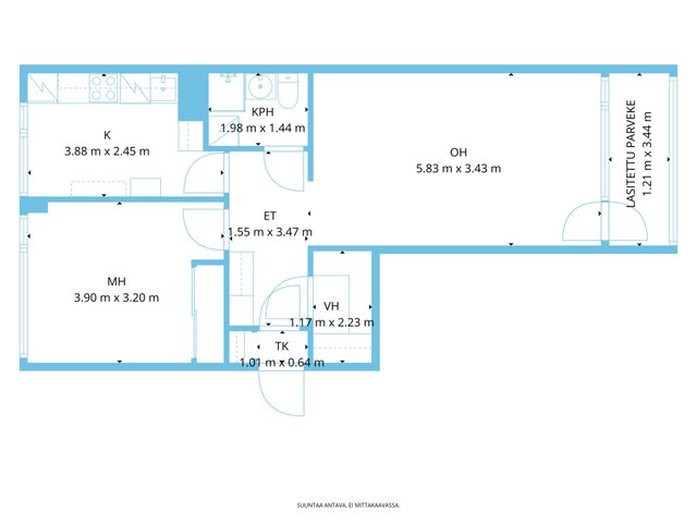 - Ei tarkistusmitattu. Pinta-alat saattavat tämän ikäisissä kohteissa (yhtiö rekisteröity ennen 01.01.1992) poiketa olennaisestikin asuinrakennusten nykyisten mittaustapojen ja standardien (SFS 5139) mukaan laskettavasta asuintilojen pinta-alasta. Pinta-ala voi siis olla edellä mainittua pienempi tai suurempi.