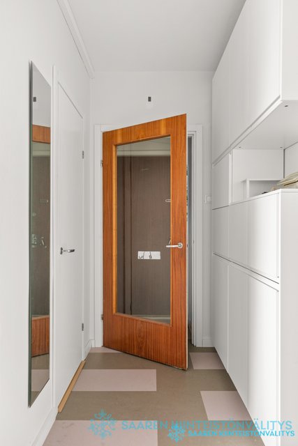 Huoneistossa on runsaasti säilytystilaa, eteisen yhteydessä on vaatehuone. Huoneistolle kuuluu myös komerot vintillä ja kellarissa.