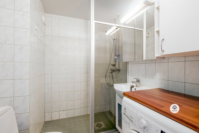 - WC-istuin, suihku, suihkuseinä, pesukone, pesukoneliitäntä, lattialämmitys, peilikaappi, pesuallas, allaskaappi, bidee-suihku, ja kaappi