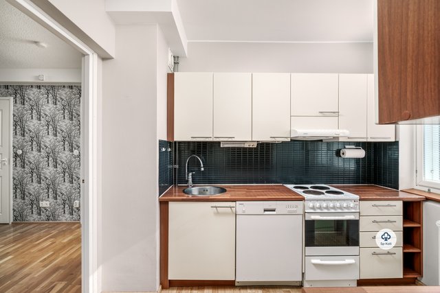 Keittiö on kauniisti varusteltu ja ikkunallinen, mikä tuo tilaan runsaasti luonnonvaloa. Kaksi makuuhuonetta tarjoavat rauhalliset puitteet lepoon, ja olohuoneen parkettilattia luo lämpimän tunnelman. Kylpyhuone on moderni ja hyvin varusteltu, ja lattialämmitys tuo lisämukavuutta.