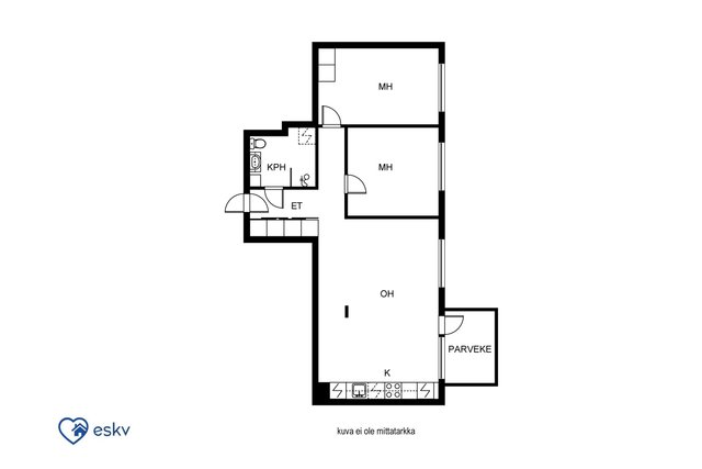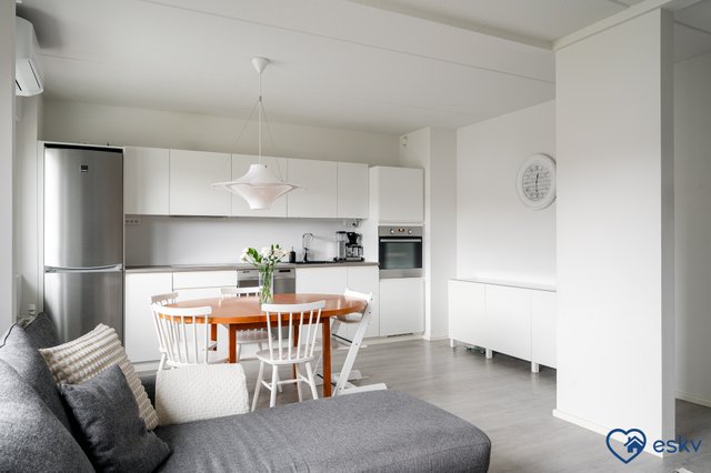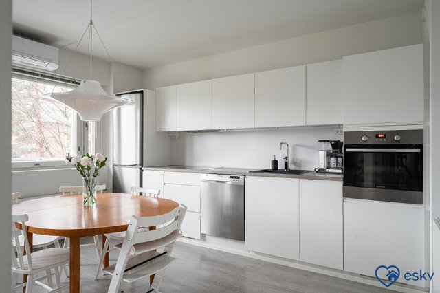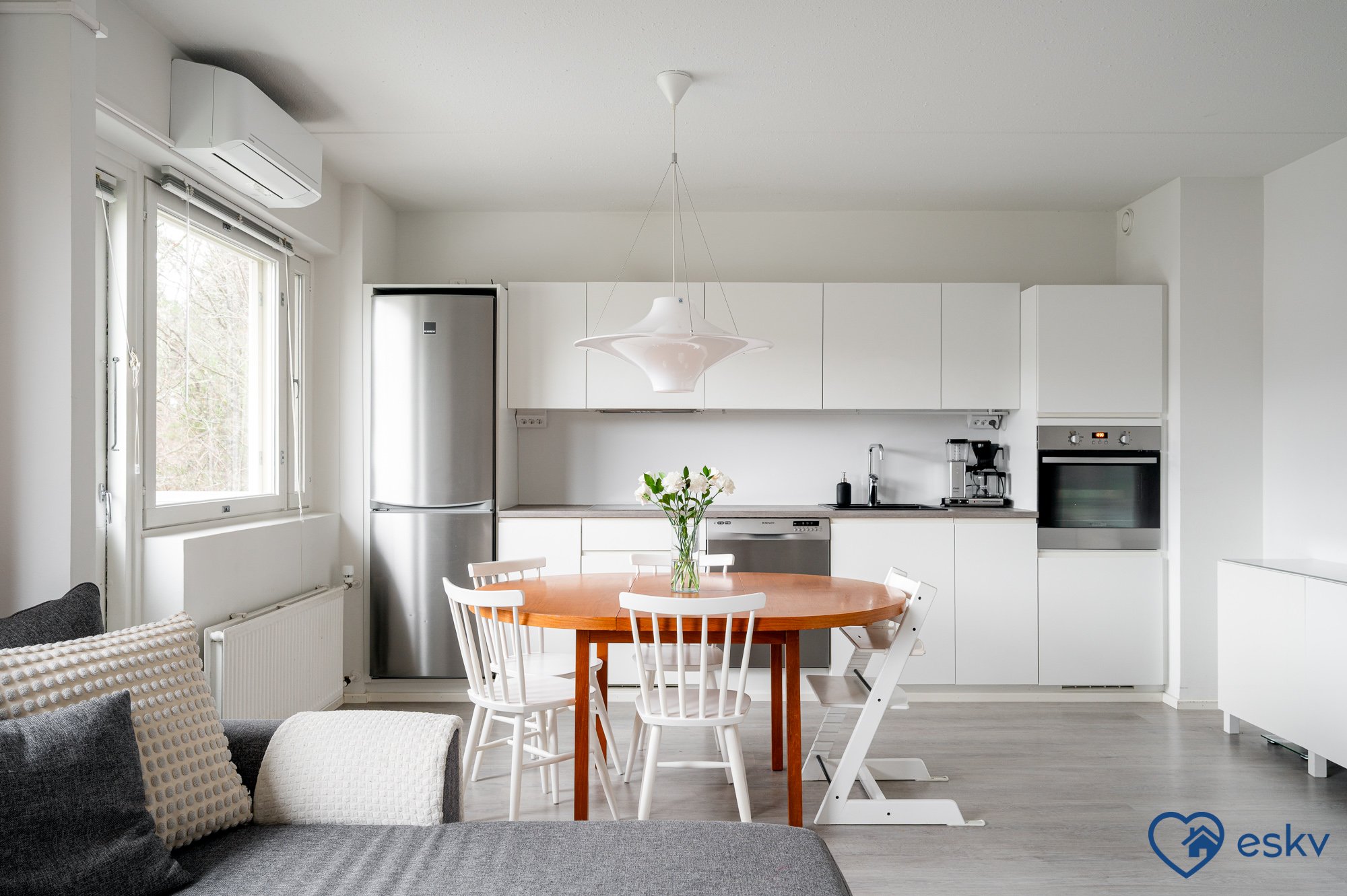 Asunnon pohjaratkaisu on käytännöllinen, ja olohuoneen sekä avokeittiön yhdistelmä luo avaruutta. Keittiössä on modernit kodinkoneet ja kaapistot. Laatoitettu kylpyhuone on tilavankokoinen ja sinne mahtuu kaikki oleellinen kuivausrumpua myöden. Kompakti parveke tarjoaa mahdollisuuden juoda kaffet auringon paisteessa.