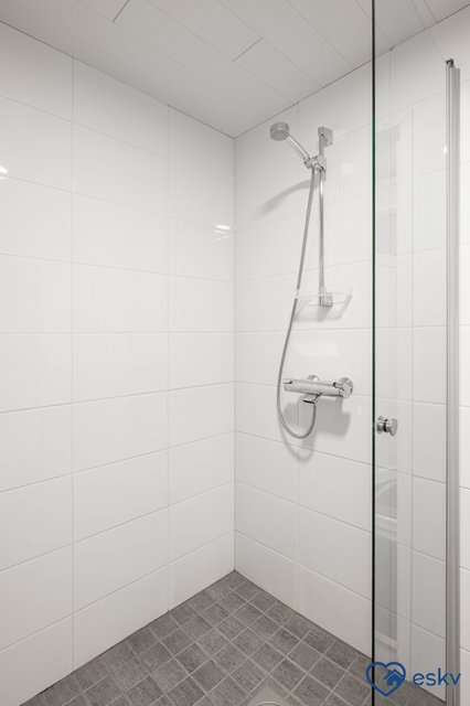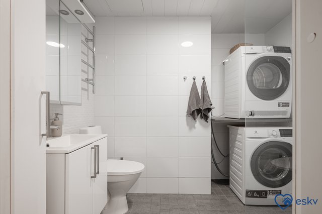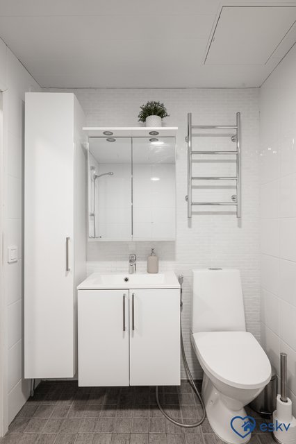- WC-istuin, suihku, suihkuseinä, pesukoneliitäntä, allaskaappi, ja peilikaappi