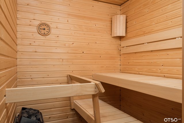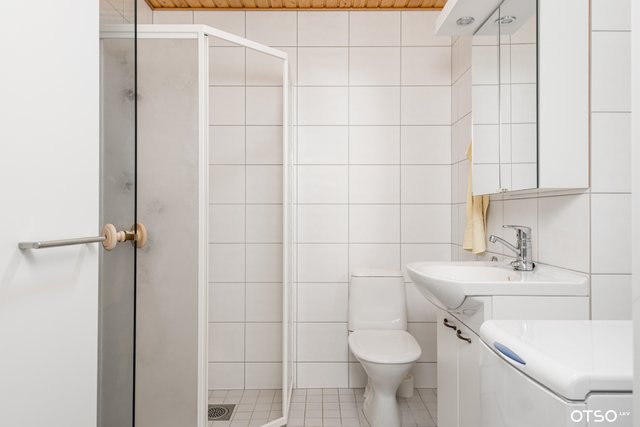 - WC-istuin, suihku, pesukoneliitäntä, allaskaappi, pesuallas, bidee-suihku, peilikaappi, ja lattialämmitys