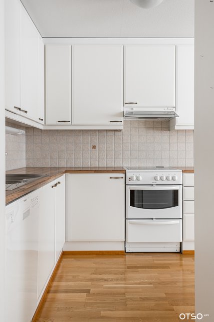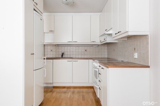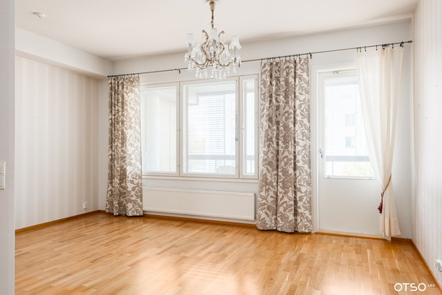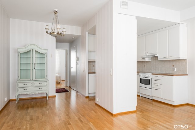 Tilava olohuone jatkuu hulppean kokoiselle lasitetulle parvekkeelle, joka tuo hyvää lisätilaa aikaisin keväästä myöhään syksyyn. Kaunis vaaleansävyinen keittiö, jossa kodinkoneet olleet hyvin vähäisellä käytöllä.