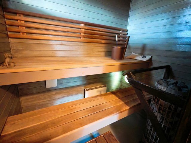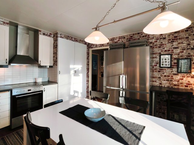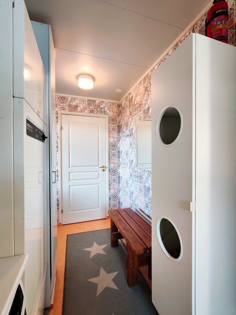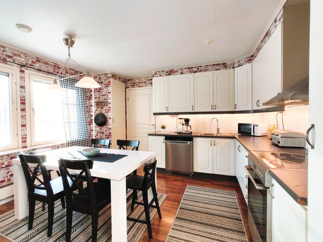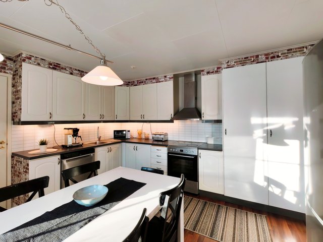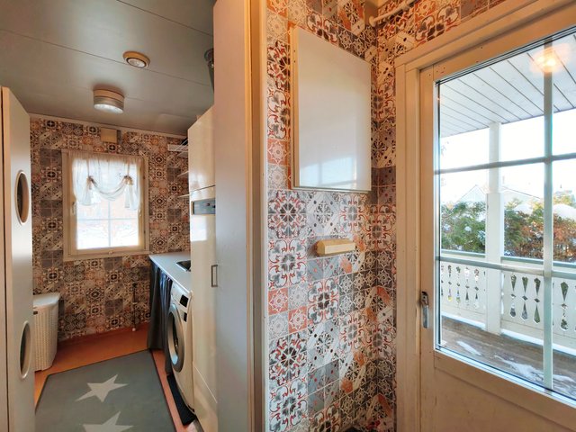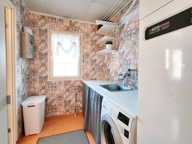 - Pesukoneliitäntä, pesuallas, lattiakaivo, pyykkikaapit, pöytätaso, ja keskuspölynimuri