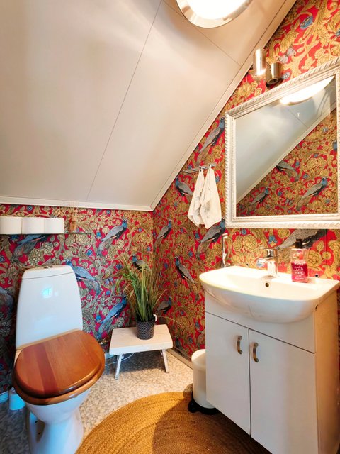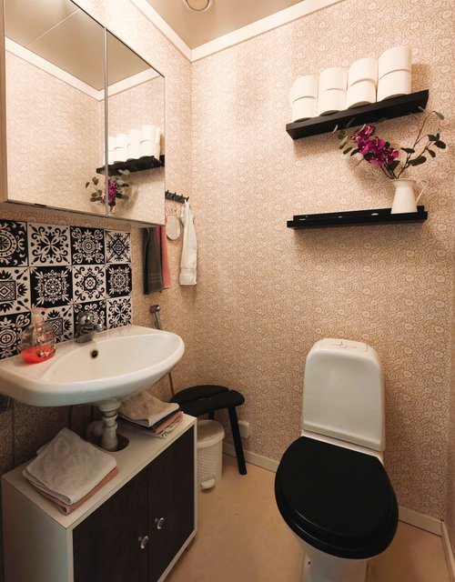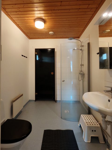 - Suihku, wc-istuin, suihkuseinä, ja peilikaappi