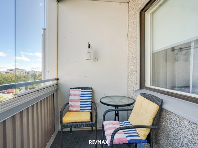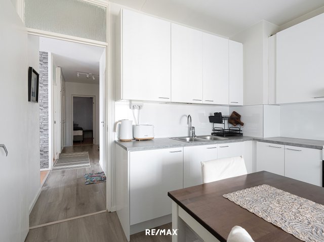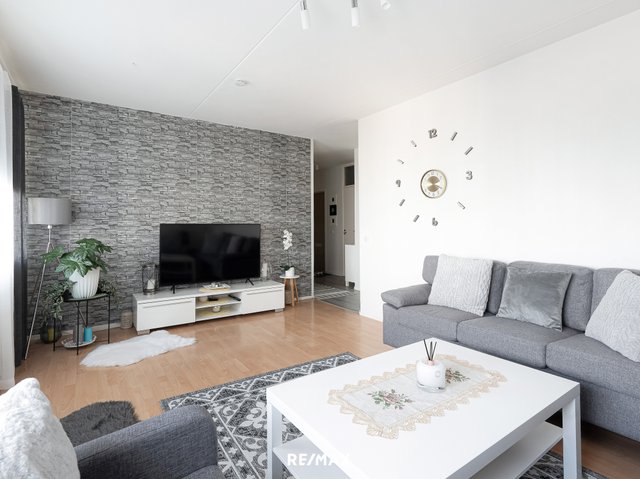 Asunnossa on kaksi makuuhuonetta, tilava olohuone ja lasitettu parveke, joka avautuu koilliseen. Keittiö on nykyaikaisesti varusteltu ja kylpyhuone on hiljattain remontoitu. Vaaleat pinnat tekevät kokonaisuudesta avaran ja viihtyisän.
