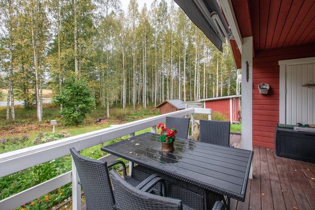 - Katettu terassi, josta näkymä piha-alueelle ja järvelle päin, ilmansuunta länteen. Markiisi lisäkatteena.