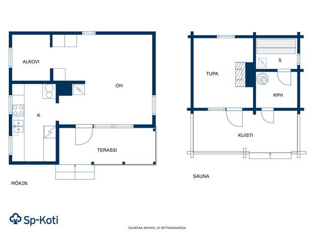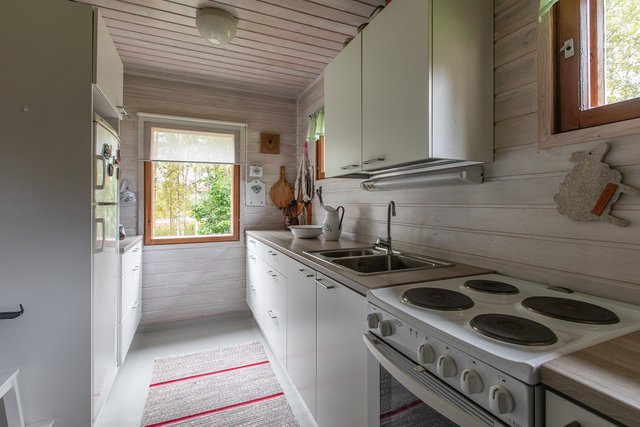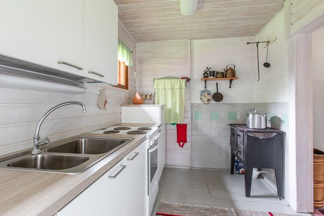 Rakennuslupapiirustuksista poiketen saunan tilalla on keittiö. Keittiön kaapistot ja pinnat on uusittu noin 5 vuotta sitten.