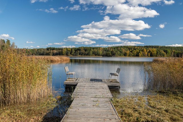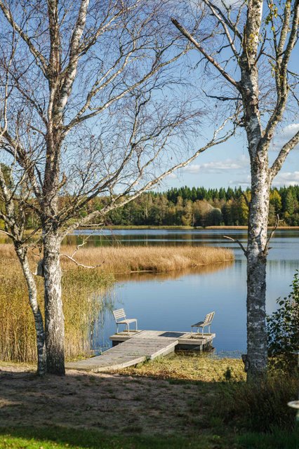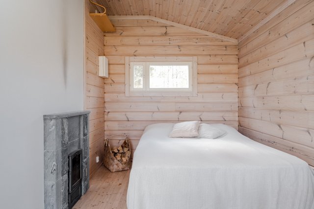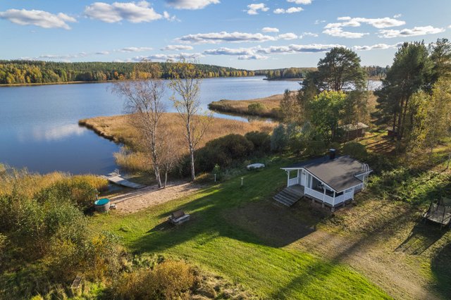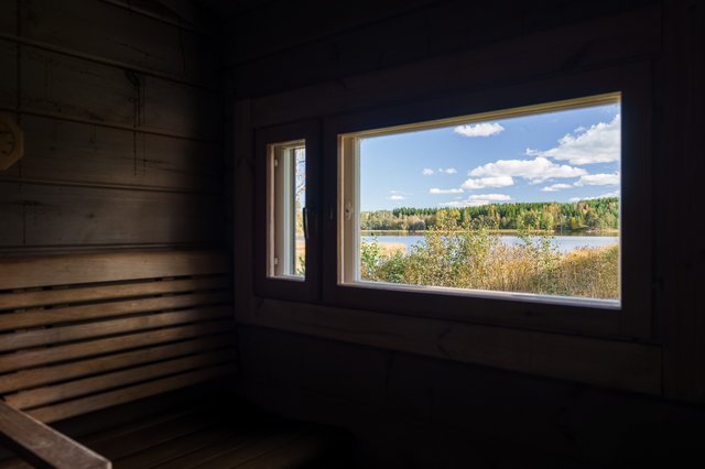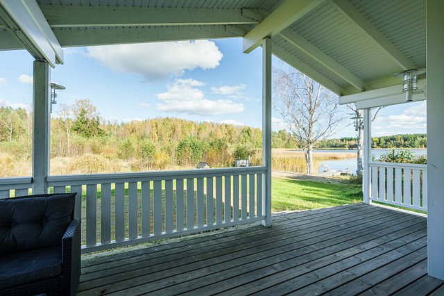 Rantaan rakennetun saunan yhteydessä on erillinen takalla varustettu huone sekä iso terassi, jossa kelpaa vilvoitella saunan jälkeen. Kaunis oma hiekkaranta, palju ja laituri.