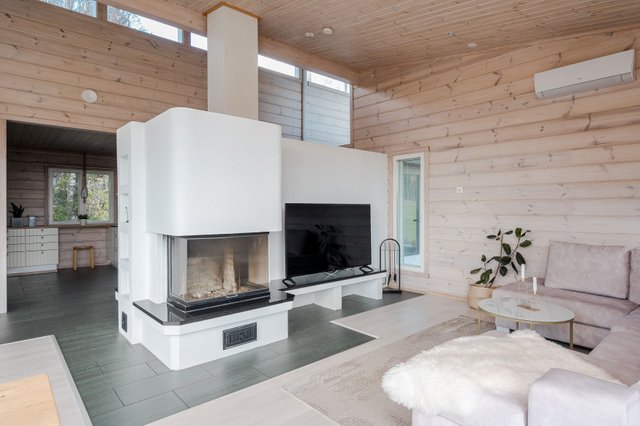 - Isot ikkunat kahteen suuntaan, mistä avautuu näkymä järvelle. Jopa 3,6 m huonekorkeus, iso moderni takka ja vaaleat värisävyt muodostavat ylellisen kokonaisuuden. Olohuoneessa on tilaa isollekin ruokailuryhmälle. Lattia uusittu ja takka maalattu 2020. Upotetut valot katossa. Seinämateriaalit: Puu Lattiamateriaalit: Laatta ja laminaatti