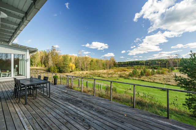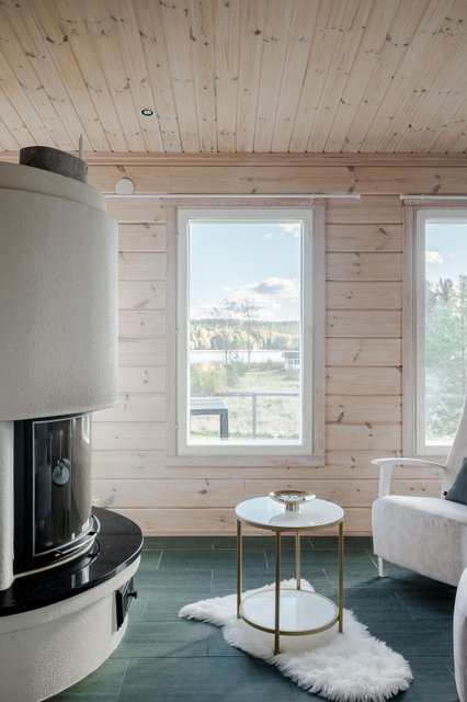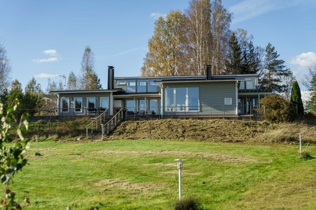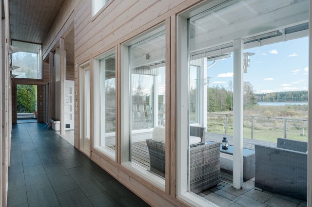 Talo on sijoitettu mäen päälle, joten lähes koko talon leveydeltä olevista ikkunoista avautuu upeat näkymät suoraan järvelle. Olohuoneessa on hulppea huonekorkeus, joka yhdistettynä kattoikkunoihin ja vaaleisiin sävyihin luo ylellisen kokonaisuuden kauniin suuren takan lisätessä tunnelmaa ja lämpöä.