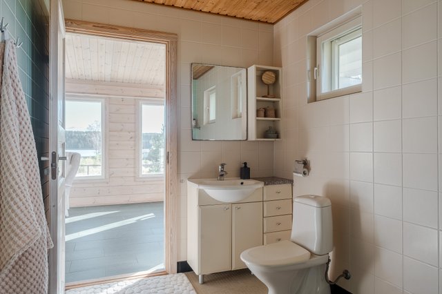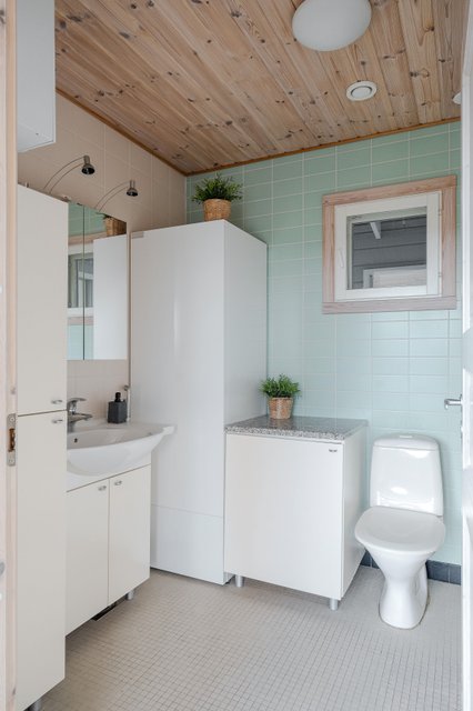 - Varusteet: WC-istuin ja allaskaappi Seinämateriaalit: Puu Lattiamateriaalit: Laatta