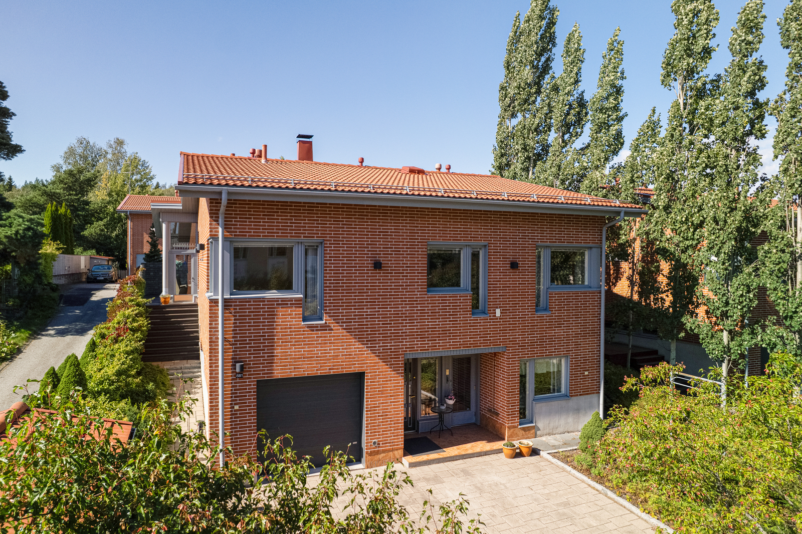 Yläkerrasta löytyvät kolme reilunkokoista makuuhuonetta sekä avara olohuone ja ruokailutila, josta on kulku lasitetulle terassille. Keittiö sijoittuu erilleen oleskelutiloista ja tarjoaa mukavat puitteet ruoanlaittoon.