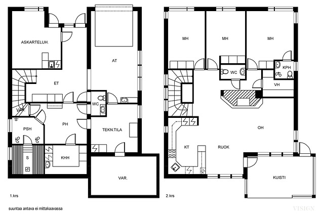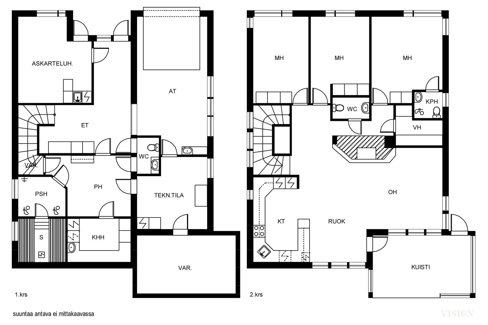 4 h, k, ask.h, rt, kphx2/s, pukuhuone, erill. wcx2, khh, vh, varastox2, lasitettu terassi, piha, at / kok. pa. 235 m² (yj. 4-5h+k+kph 135 m2 + kellaritila)