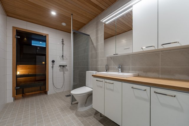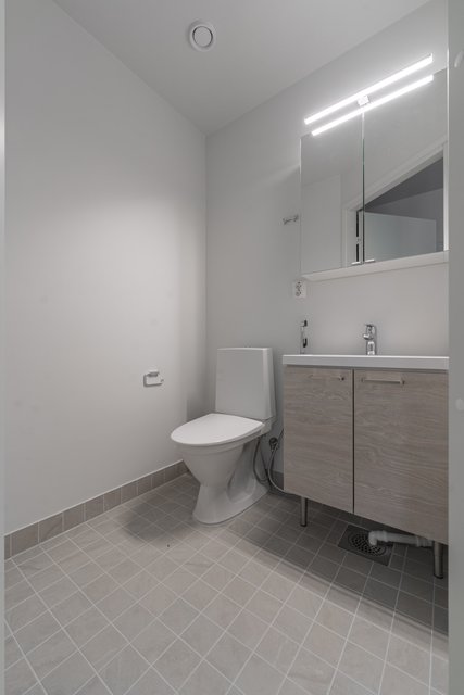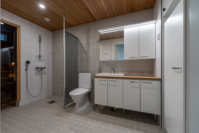 - Allaskaappi, wc-istuin, peilikaappi, suihkuseinä, pesukoneliitäntä, suihku, lattialämmitys, ja kiinteät valaisimet