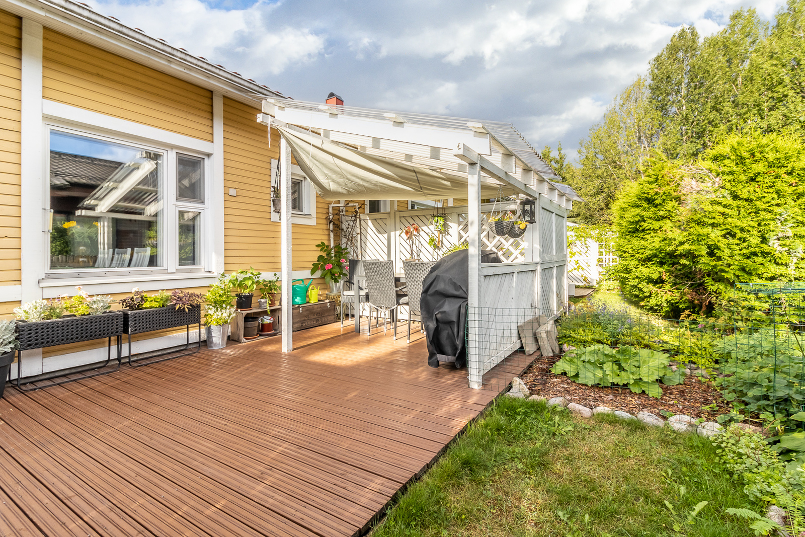 Takapihalla on viihtyisä tilava terassi sekä helppohoitoiset nurmialueet.