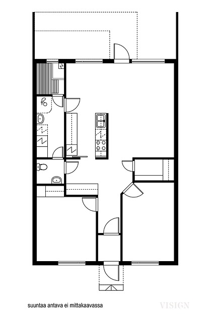 Talossa tilat ovat kätevästi yhdessä tasossa. Keittiö ja olohuone muodostavat viihtyisän tilan perheen yhteiseen oleskeluun. Keittiössä on sopivasti työtasoa. Värimaailma täällä on selkeä ja rauhallinen. Kaksi makuuhuonetta ja iso vaatehuone.