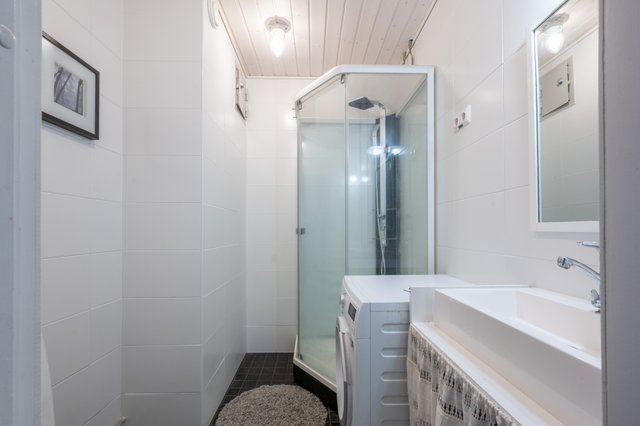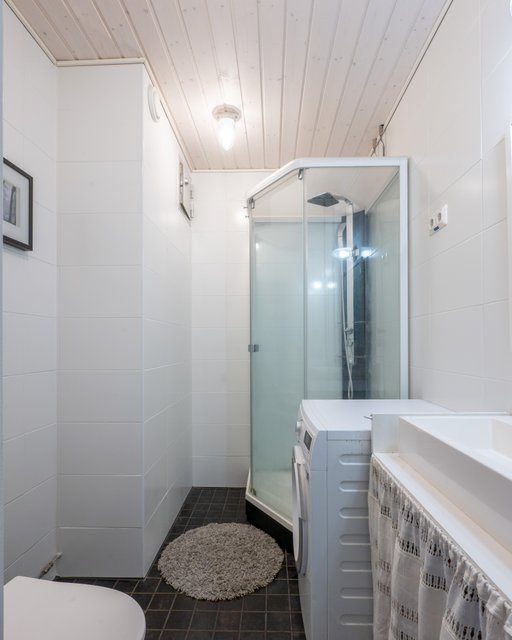- WC-istuin, suihkukaappi, lattialämmitys, peili, pesukoneliitäntä, bidee-suihku, ja allaskaappi