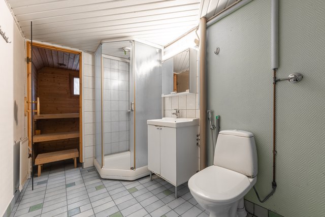 - WC-istuin, suihku, suihkukaappi, pesukoneliitäntä, allaskaappi, ja lattialämmitys