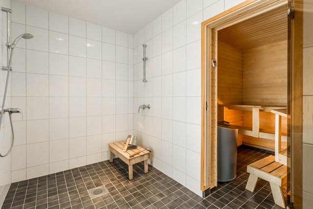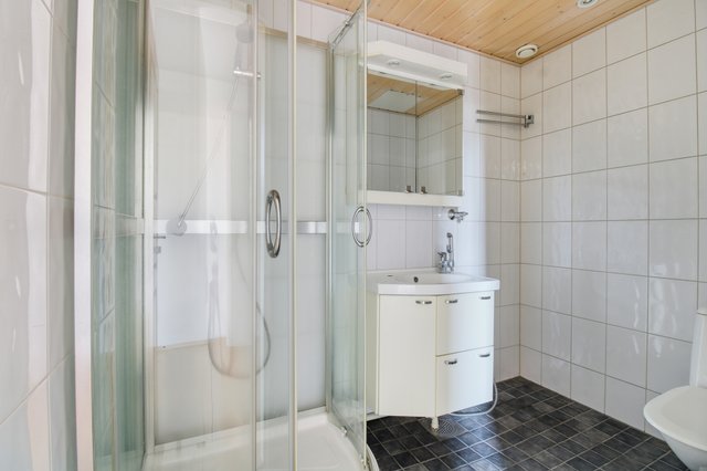 - WC-istuin, pesukoneliitäntä, lattialämmitys, pesuallas, allaskaappi, bidee-suihku, suihkukaappi, ja suihku