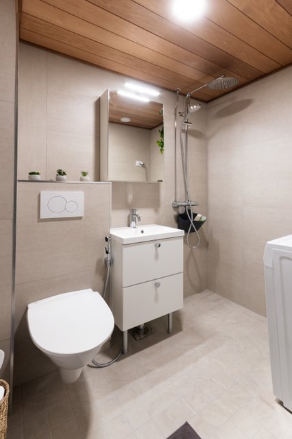 - Tyylikäs juuri saneerattu kylpyhuone: Seinämateriaali: kaakeli Lattiamateriaali: laatta Varusteet: peilikaappi, pesukoneliitäntä, suihku, wc