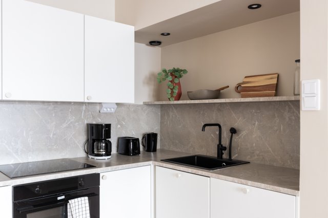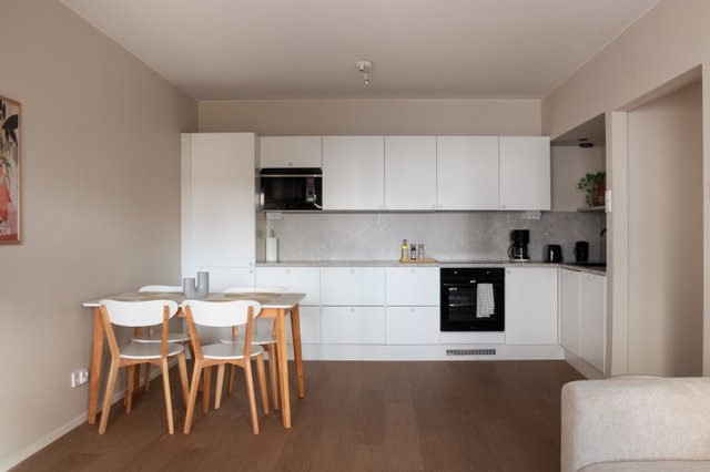 - Tyylikäs juuri saneerattu avokeittiö: Lattiamateriaalit: vinyyli Työtaso: laminaatti Varusteet: astianpesukone, mikroaaltouuni Liesi: keraaminen Jääkaappi ja pakastin: jääkaappi/pakastin