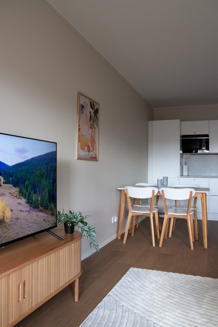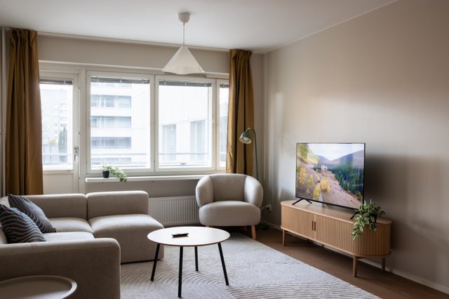 - Juuri pintaremontoitu olohuone, jonka yhteydessä lasitettu parveke sisäpihan näkymin. Lattiamateriaalit: vinyyli Seinämateriaalit: maalattu