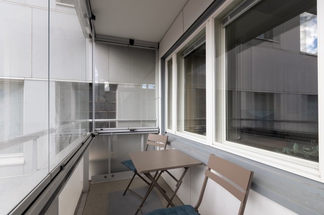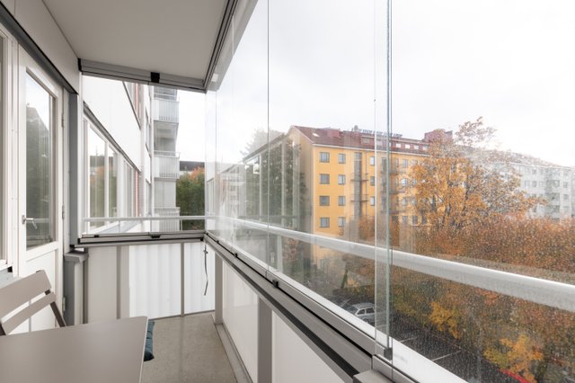 Asunto sijaitsee taloyhtiön neljännessä kerroksessa sisäpihan näkymin. Asunnon lisähuoneena toimii suuri lasitettu parveke Hämeenkadun puolelle.