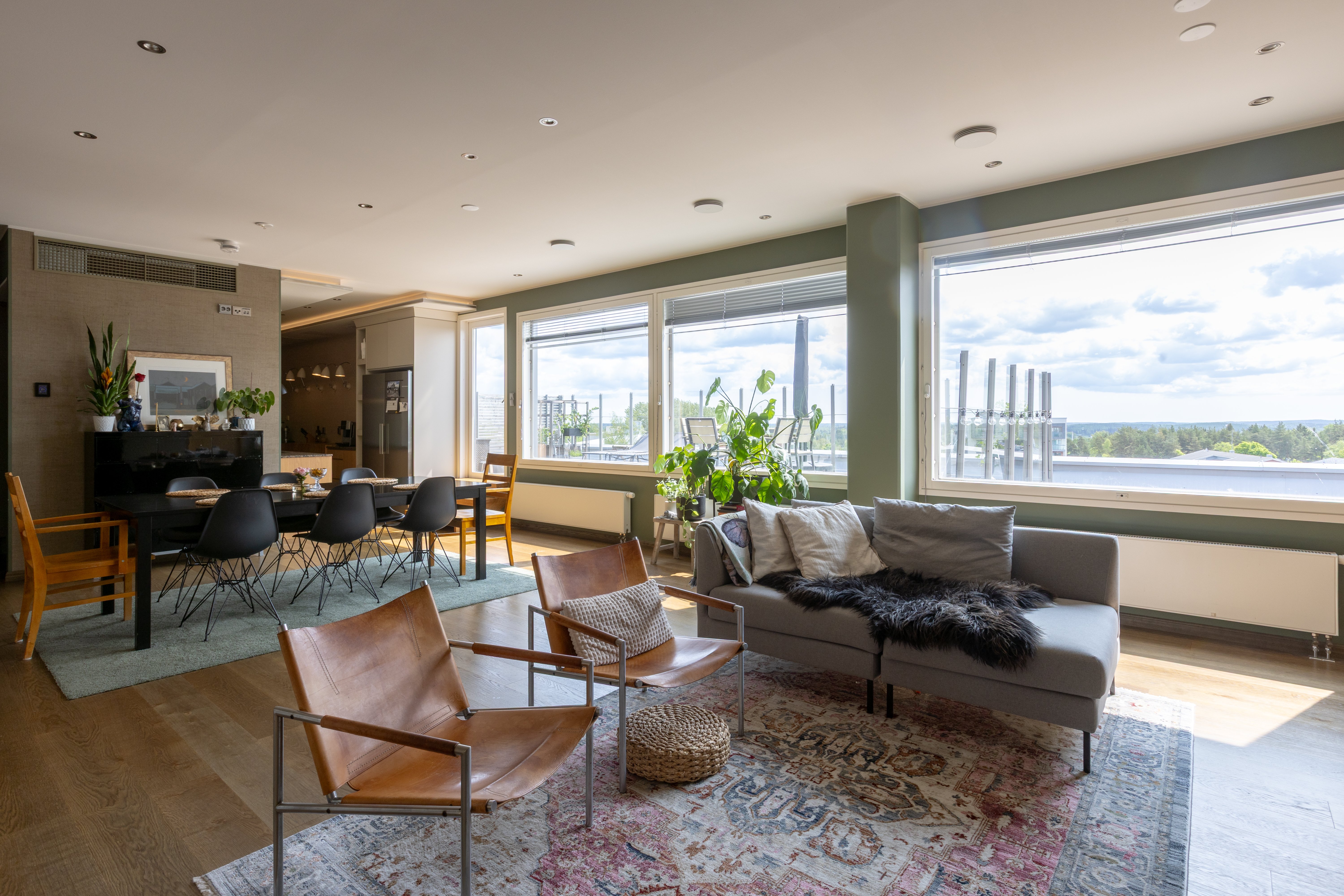 Ammattilaisen kädenjälki näkyy mielenkiintoisissa materiaaleissa, hienoissa väriyhdistelmissä ja kestävässä laadussa. Sisään astuessa isot ikkunat, hienot maisemat ja kookas olohuone/ruokailutila tervehtii tulijaansa. Neljä makuuhuonetta ja erittäin monikäyttöinen ja tilava kodinhoitohuone/pukeutumistila. Maisemasauna ja kylpyamme.