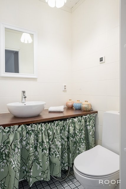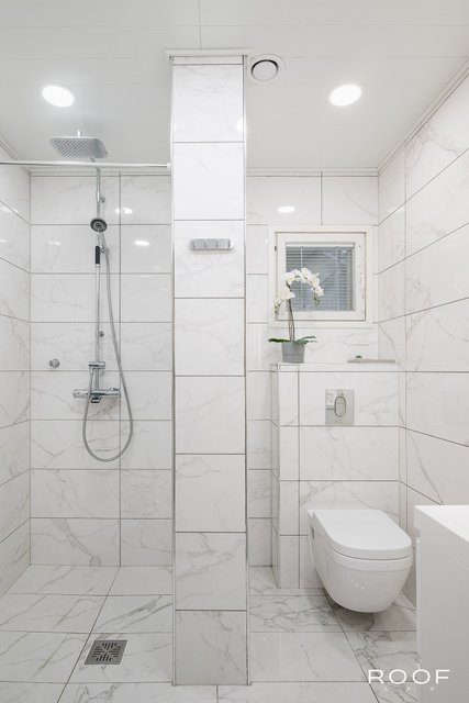 - Suihku, suihkuseinä, wc-istuin, allaskaappi, ja lattialämmitys