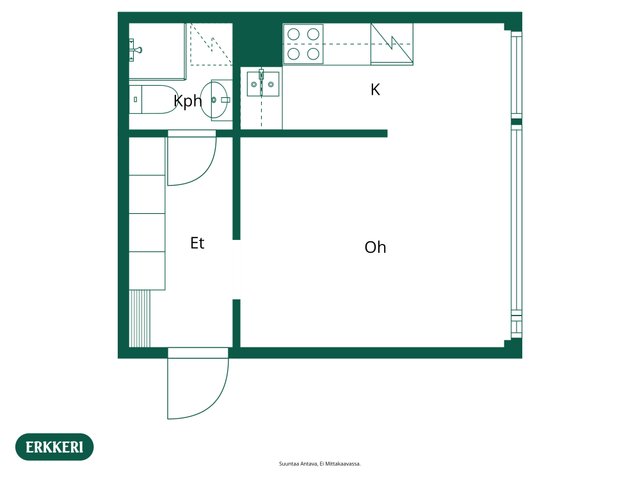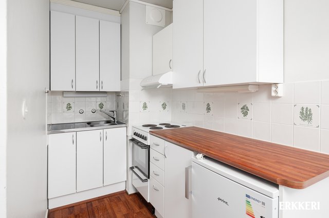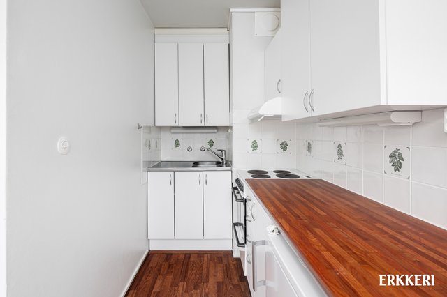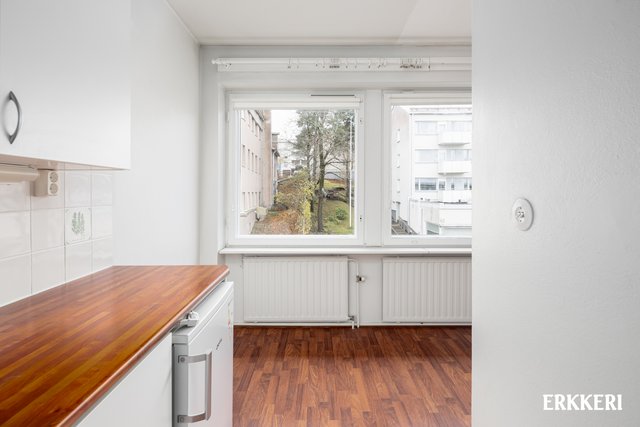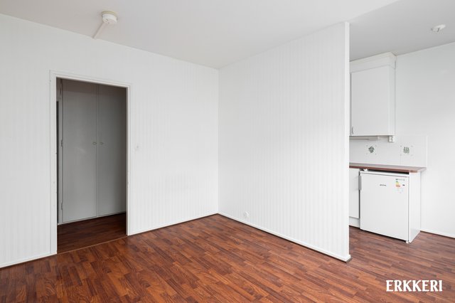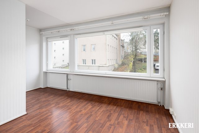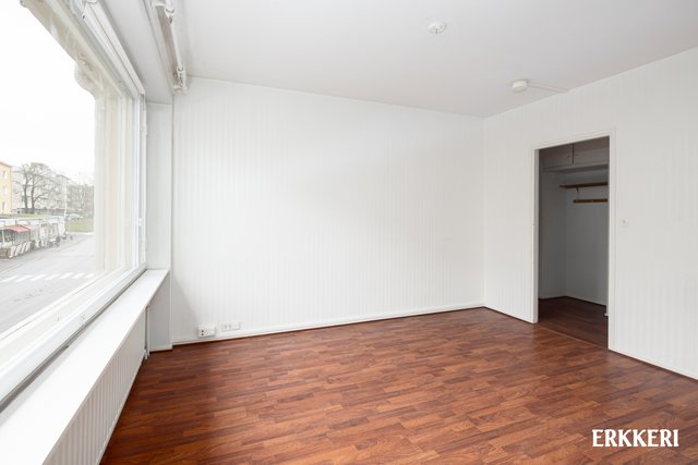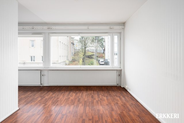 Asunnossa on selkeä ja toimiva pohjaratkaisu, joka tekee neliöistä tehokkaat. Suuret ikkunat tuovat runsaasti luonnonvaloa sisään ja korostavat tilan avaruutta. Huoneiston yhteydessä on myös käytännöllinen keittosyvennys ja tilava kylpyhuone.