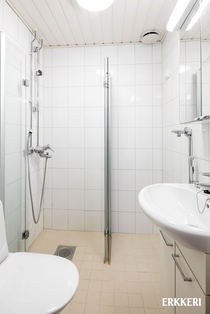 - WC-istuin, suihku, suihkuseinä, peilikaappi, pesuallas, pesukoneliitäntä, bidee-suihku, ja allaskaappi