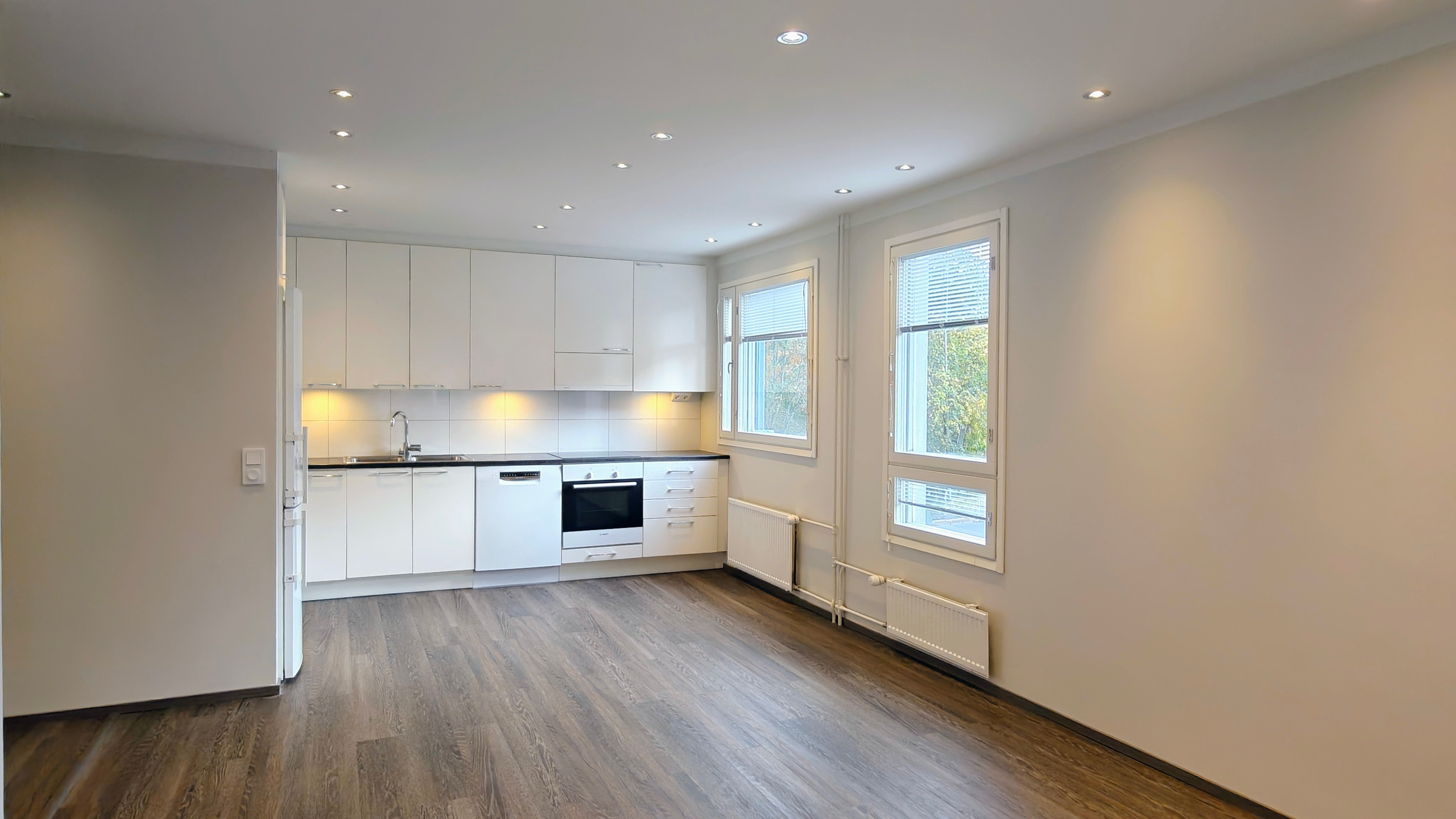 - Avokeittiö, tilaa ruokapöydälle. Ikkunoista näkymä etelään (lounas), Keittiö remontoitu/muutettu 2014, laminaatti asennettu, Jää-/pakastinkaappi, kalusteisiin upotettu sähköuuni ja keraaminen liesitaso, astianpesukone (uusi), Runsaasti kattoon upotettuja valaisimia.