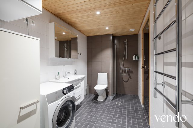 - Suihku, wc-istuin, suihkuseinä, lattialämmitys, pesuallas, peilikaappi, pesukoneliitäntä, allaskaappi, ja bidee-suihku