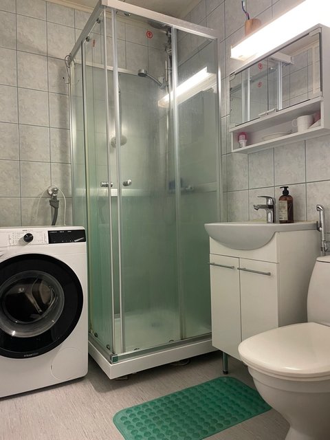 - WC-istuin, pesukoneliitäntä, suihkukaappi, peilikaappi, pesuallas, ja allaskaappi