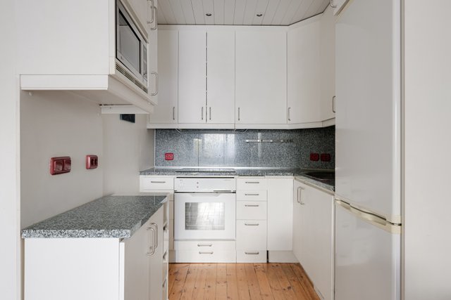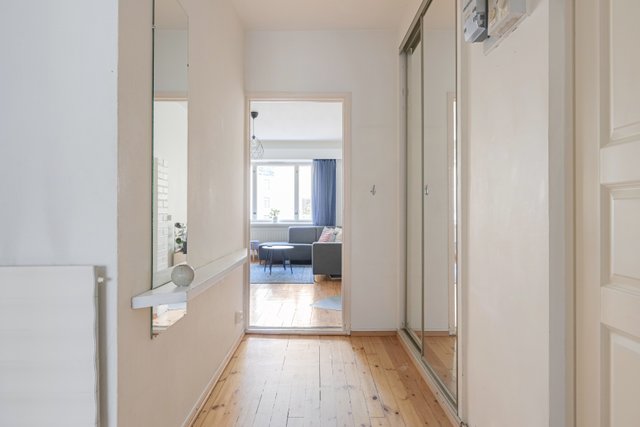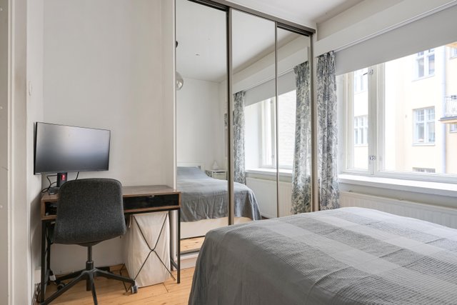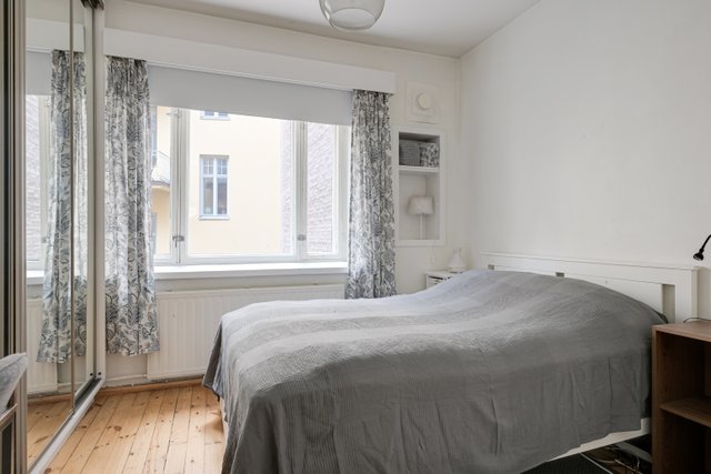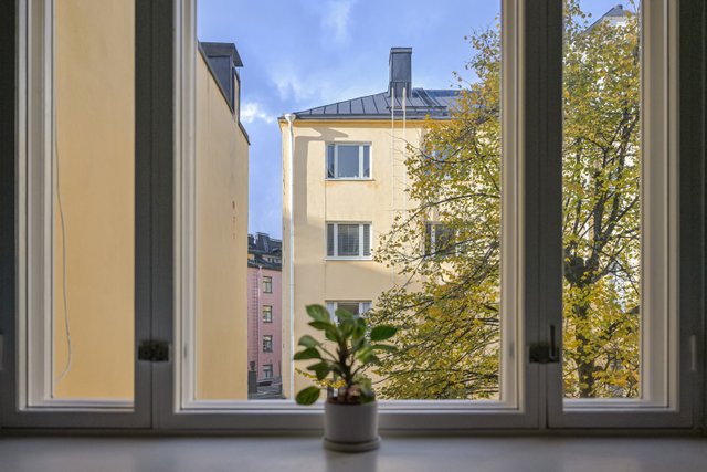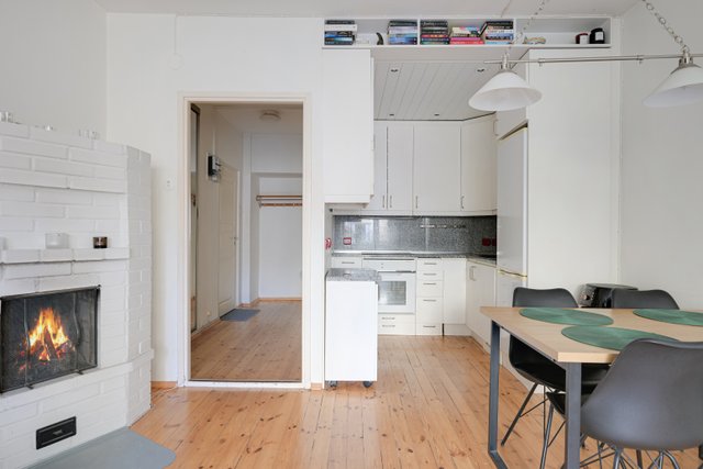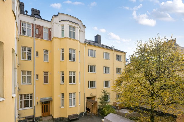 Läpitalon huoneisto tarjoaa viihtyisää asumista toisessa kerroksessa. Olohuoneen ikkunoista avautuvat rauhalliset näkymät sisäpihalle, ja makuuhuoneesta avautuu näkymä talon takapihan vehreyteen. Toimiva keittiö yhdistyy luontevasti tilavaan olohuoneeseen, jonka tunnelmaa korostaa kaunis, tosin käyttämätön, takka.