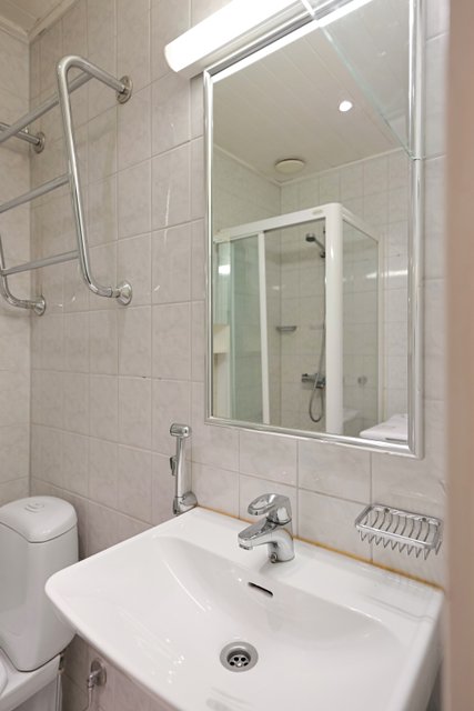 - WC-istuin, suihku, suihkuseinä (ovet 2 kpl), pesukoneliitäntä, bidee-suihku, peilikaappi, ja pesuallas