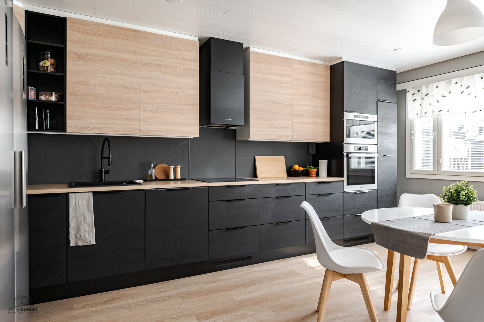- Lattia vinyyli, seinät maalattu. Varustelu: Induktioliesi, uuni, integroitu mikroaaltouuni, jääkaappi, pakastin, säädettävät led-valot, liesituuletin, integroitu astianpesukone.